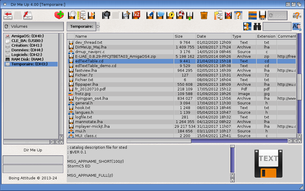 - On peut maintenant changer les types de volumes et volumes sélectionnés à partir du clavier : [Amiga]+[<-] type de volume précédent, [Amiga]+[->] type de volume suivant, [Amiga]+[flèche haut] volume précédent, [Amiga]+[flèche bas] volume suivant.